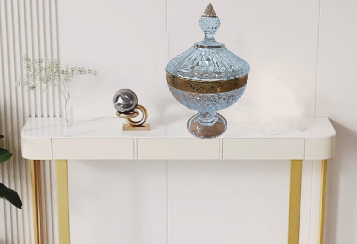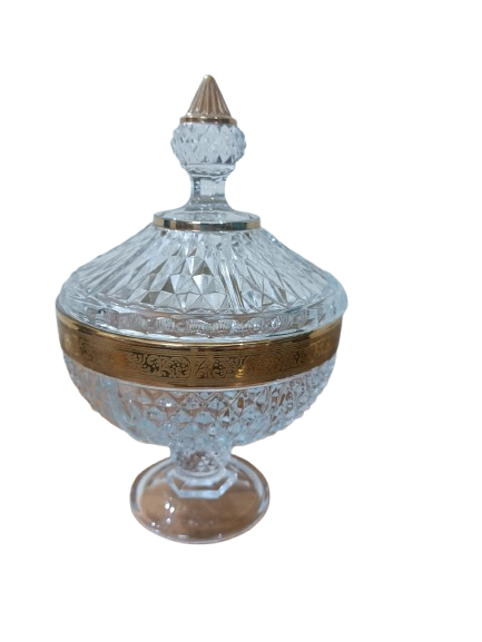 This beautifully crafted crystal jar features a rich diamond-cut design and an ornate gold-toned band, offering a timeless and regal look. Perfect for candies, dry fruits, or purely decorative use, it adds a hint of royal charm to any space.